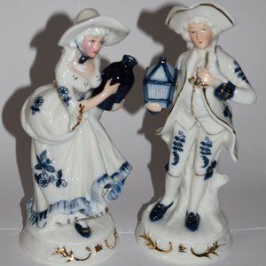 This Vintage Courting Couple Glazed Porcelain Figurines 18th Century Style with 22k gold accent have lovely features and excellent details. A great pieces to have in your collection.