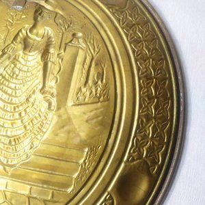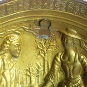 Very pretty pressed metal, embossed, decorative wall plate, plaque, with an antique courting scene. It is gold, very shiny. There is a black accent, usually we see them a little bit all over the plate but here, it is mostly on the dress of the lady. It is a markers flaw probably, or not, but it's not a damaged sign. it's is a unique mark. The plate has a lot of great details, the romantic scene is beautiful. The rim has great details too. There is a black spot on the lower rim, probably a burn mark, i didn't try to remove it or polish it. I leave it up to the buyer. There is not dent. The patina and other marks are consistent with age. Non smoker home.