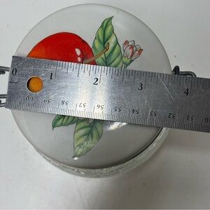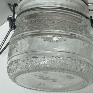 Vintage Cove clear 1/2 L bale wire canning jar with painted ceramic lid. Made in Italy. This is a beautiful jar with vining florals on the glass portion and a vintage apple illustration on the ceramic lid. This would be a lovely addition to your pantry. In excellent preowned condition with no cracks, chips or damage to the apple image.