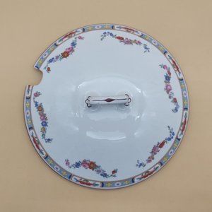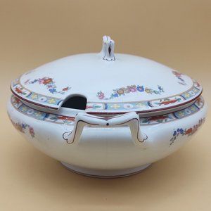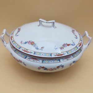 Made by J&G Meakin in England in the 1950s or 60s, this is a covered serving dish ideal for stews or soups. Crack, chip & crazing free, the bowl is decorated with bouquets of different colored flowers. The band along the edge is filled with fruit and geometric patterns.