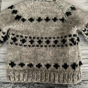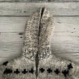 This vintage hand-knitted wool Cowichan sweater cardigan jacket for kids is a heavyweight, full zip hooded outerwear piece perfect for various occasions such as travel, parties, or casual wear. The geometric gray pattern and long sleeves make it a versatile and stylish addition to any wardrobe. Made in Canada with chunky wool knit, this sweater is ideal for keeping kids warm during all seasons. The hippie and southwestern boho character accents add a unique touch to this classic, bohemian piece that is sure to stand out in any crowd.