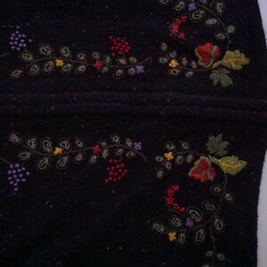 This vintage Craft Barrel black knit cardigan is a charming and quirky piece, featuring beautifully embroidered grapevine and fruit details throughout. The zip-up front adds a practical touch while the bold embroidery brings whimsical personality, perfect for fans of eclectic vintage and playful seasonal style.