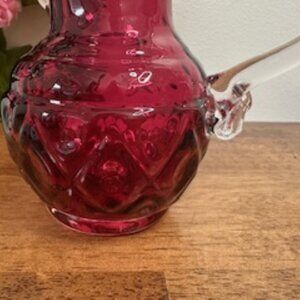 Vintage Cranberry Diamond Pattern Glass Pitcher‎ – Sculptural Handle Mid-Century