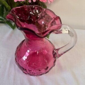 Vintage Cranberry Glass Pitcher – 20 oz Clear Handle Swirl Design