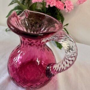 Vintage Cranberry Glass Pitcher with Twisted Clear Handle – Swirled Diamond Pat