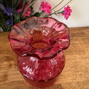 Vintage Cranberry Glass Vase Diamond Thumbprint Pattern Ruffled Rim
