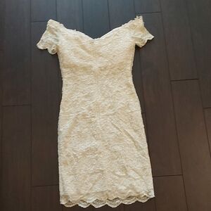 This cream mini dress showcases a sophisticated off-the-shoulder neckline and cap sleeves, ideal for a bridal or cocktail event. The sheath silhouette and intricate lace overlay offer a refined and elegant look.