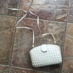 This is a checkered silk ribbon/paten leather hard case clutch. Lots of room for essentials inside with three compartments - one zipper pouch.
