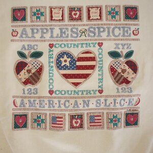 Bring a playful touch of Americana charm to your wardrobe with this Vintage Active Wear sweatshirt, made in the USA and designed with a creamy neutral base that pairs effortlessly with denim, cargos, or lived-in vintage pieces. The front features a bold country-inspired graphic with apples, quilt blocks, hearts, and folk-art details, creating that warm Cabincore appeal that’s perfect for transitional seasons. The cotton-blend fabrication offers that classic vintage sweatshirt texture collectors love, and the attached polo-style collar with embroidered edging adds an unexpected visual twist that leans into an Eclectic Grandpa aesthetic.