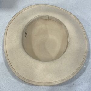 Vintage cream toned hat with black ribbon and feather detail. No material or label tag but either felt or wool fabric. Rim can be manipulated. Good pre owned condition. Please see photos, measurements are for reference only. Reasonable offers welcome!