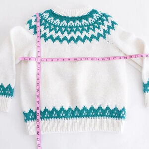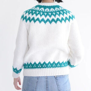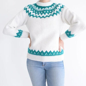 Step into timeless style with this vintage cream knit crewneck sweater featuring stunning teal Cowichan and Fair Isle patterns. Inspired by traditional Icelandic fisherman sweaters, it offers cozy warmth and classic heritage appeal. The intricate knit design blends cultural artistry with durable construction, making it perfect for layering on crisp fall and winter days.