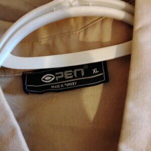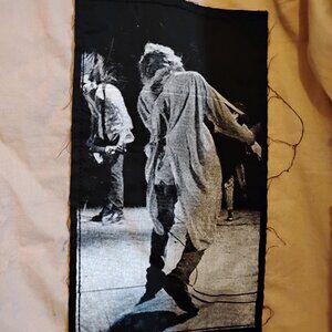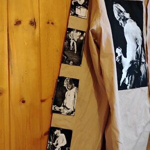 A unisex cream button up long sleeve vintage XL t-shirt (fits more like a large) from Open with assorted Nirvana/Kurt Cobain patches all over it, and the text The Grunge Years along one sleeve. Shirt has been worn but is still in very good condition.