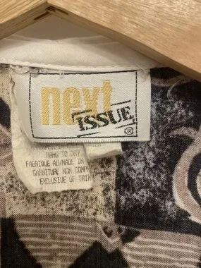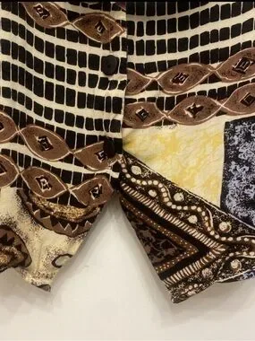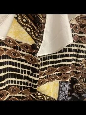 Cream blouse with a soft ruffled collar and long sleeves. Front features a warm multi-patterned panel in brown and black tones for a statement look. Lightweight and versatile—pairs easily with skirts or tailored pants. Elegant cream color adds a refined touch to any outfit.
