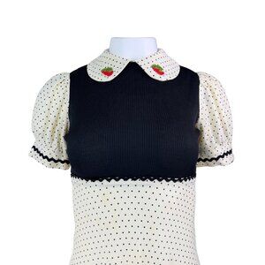 Black bodice on top of cream polka dot layered skirt with short gathered sleeves and adorable strawberries on the collar.