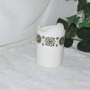 RETRO ironstone creamer, Malaga by Johnson Brothers. White background, avocado green and burgundy or deep brown medallions & scroll pattern. Smooth rim.