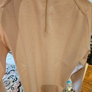 This is an immaculate high end crew neck sweater. It has a zipper at the back. The weave is fine and you can tell it's a lovely, top shelf piece. There are no tags, but has been kept in a private collection well maintained and packaged. It is a women's M-L