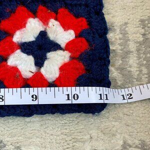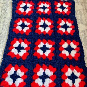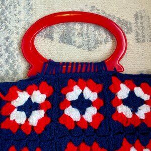 Vintage crochet bag with red plastic handles in excellent vintage condition. Navy blue with red and white. Measures 11 inches across by about 14.5 inches tall. Cat friendly, nonsmoking home.