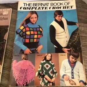 Set of vintage crochet pattern books featuring colorful designs. Perfect for crafting enthusiasts.
