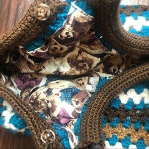 Excellent pre owned condition. Teal blue, brown, tan & white. Acrylic handles. Two snap button closure. Cute teddy bear lining. Accented with buttons and spiral crocheted knit.