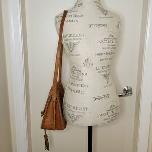 Rich Orange Tan Brown, textured crocodile nose bone, Extremely Rare (alligator being more common), Hand stiched trim, YKK zipper pocket, Good Vintage Condition, lots of pen markings on inside flap, a few breaks in the stitching (nothing noticeable), Hight-8" Width-9" Depth-5" Strap Drop-17".