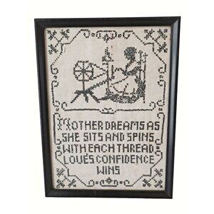 For your consideration is a vintage cross stitch sampler of a woman seated with a spinning wheel and a poem, circa early 1900s.