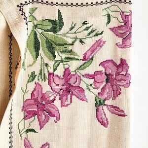 Vintage Cross Stitch embroidered Floral Purple Lilac Ivory Tablecloth