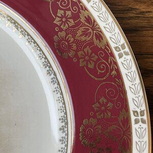 In the center of the plate is a photo portrait of the young Queen Elizabeth II. The burgundy-colored plate is richly decorated with a floral gold ornament. A gold ornament also frames the photo of the Queen and the edges of the plate.
