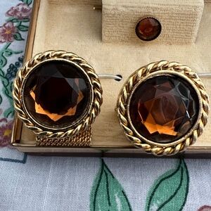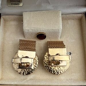 Wonderful pair of vintage cuff links and matching tie pin in original box. Deep dark caramel coloured stones set in gold tone metal mesh finish. Fully operational.
