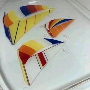 Vintage Culver ServeMates clear acrylic serving tray with sailboats and seagulls. This cheerful tray is adorned with sailboats in bold primary colours. The paint is intact and undamaged. The tray has surface scratches from use over time, particularly around the bottom edge. Measures 18 x 12.75”