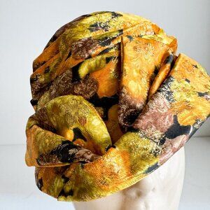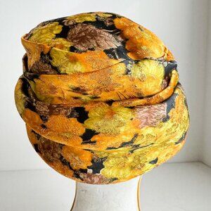 Vintage Custom Made Floral Orange Brown Gold Lurex Pill Box Hat M