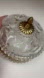 Vintage lidded dish made of clear, cut crystal or pressed glass. It features a rounded body and a domed lid. A decorative brass-colored metal band with a filigree design wraps around the middle of the dish. The lid is topped with a prominent brass finial. The glass itself has a distinctive pattern, which includes floral motifs on the lid and a series of raised bumps or facets around the rim and base. Could be use like a trinket box, candy dish, or potpourri holder, and its style is often associated with Hollywood Regency.