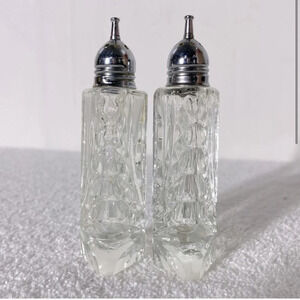 Great vintage condition. No chips or cracks. There is some residue inside one of the shakers, see close ups. I did soak in soap and water and then scrubbed with a tiny bottle brush but was unable to remove it all. I have allergies to harsher cleaning agents so I only tried warm water and soap. Please look at all pics and zoom in for a closer view. Measurements in pics. No rust in the lids.