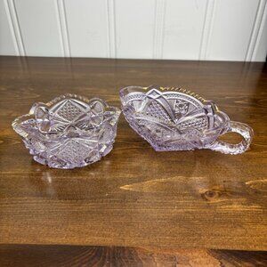 Lovely vintage pressed glass creamer and sugar bowl set in a delicate amethyst hue with gold gilded edge accents. The intricate pressed patterns mimic cut glass, adding sparkle and elegance to any table. Mid-century style, perfect for tea service, display, or gifting. Based on the style, mold pattern, and pressed glass technique with gold gilded accents, this amethyst glass creamer and sugar bowl set most likely dates to the 1950s–1970s.