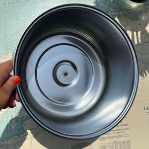 Vintage glass and chrome cake stand / plate with lid / dome. No indication of maker, black plastic handle on lid with cut / faceted glass plate. Very good condition, lid shows a little rust inside. Measures approx. 12.5" wide, 6" tall.