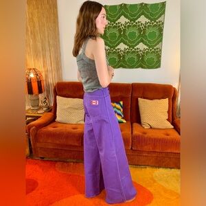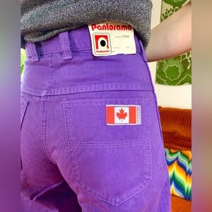 I have two pairs of these vintage DEADSTOCK purple "Pantorama" wide leg jeans. Made of 100% cotton. Both have "groovy" stitched on the back pocket. XL large pair has a metal Canadian flag attached and the XS/S pair has a Canadian flag fabric patch stitched to the back. In excellent condition! No major flaws to note, still has the original tags, NEVER BEEN WORN!