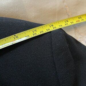 Classic black blazer with two front pockets, brass button details on front and sleeve cuff area. Fully lined and in very good used condition. The fabric and size tags are missing. This looks like a wool crepe fabric which is usually associated with this brand.