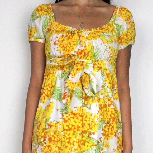 Scoopneck mid-length dress, with front slit, t-shirt sleeves, and a sinched wasit, 100% cotton.