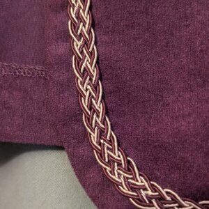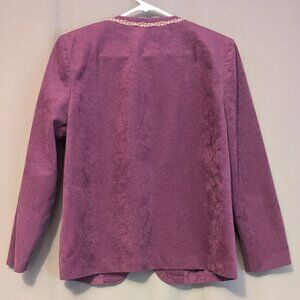 Very cool vintage piece. Women's tailored blazer in mauve purple colour. Velvety fabric with rope detail around the collar and down lapels. Rope detail does not continue around back. Shoulder pads. Size 10, excellent condition.