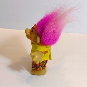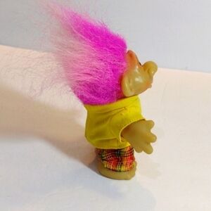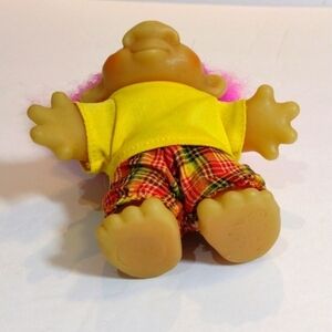 Vintage Dam 1986 PVC Troll Doll Purple Hair Yellow Shirt Plaid Pants