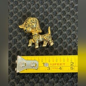 Featuring a small foo dog design. The brooch is gold-toned with intricate black detailing in the Damascene style. It has a secure pin back closure.