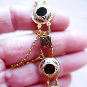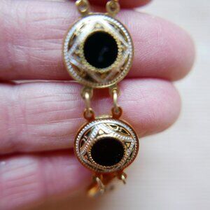 Vintage Mid-Century Damascene Round Link Bracelet. This eye-catching piece features the classic black and gold Damascene art, reminiscent of fine Spanish Toledo jewelry. A timeless, Art Deco-style statement piece.
