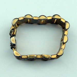 Vintage Damascene-style bracelet, likely made in Spain during the mid-1950s. Inner circumference is approx. 7-1/4". If your wrist is 6-1/2" like mine, it will likely feel a tiny bit too loose.