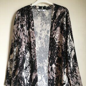 Very good preowned vintage condition, long-sleeved, cozy, white coloured knit open cardigan, featuring an all over seamless print of lace, damask and flowers in black, champagne pink and tan. A fun, but sophisticated piece by Alia.