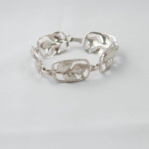 Add a timeless touch of nature to your jewelry collection with this stunning vintage Danecraft sterling silver bracelet. Featuring five beautifully detailed openwork panels adorned with pinecones and needles, this piece exemplifies Danecraft’s mastery of botanical design and craftsmanship.