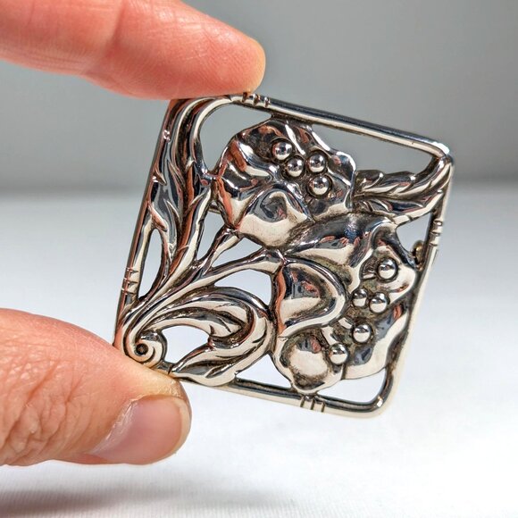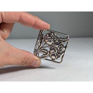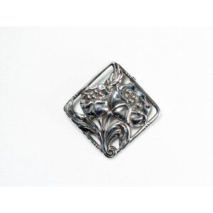 A lovely Art nouveau inspired square floral brooch by Danecraft in a sterling silver. Marked on the back " Danecraft Reg´d Sterling". In good shape with a short pin on a roll-top clasp closure, the sterling silver discolored. Perfect as a thoughtful gift to yourself or a loved one.