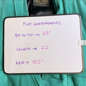 Super cool 90s leather jacket. Great vintage condition. Minor signs of wear shown in pics. Has shoulder pads. Is awesome. Nice bright Teal colour. No size tag. Size M chosen based on fit and measurements in pics. Could also fit L, please see measurements.