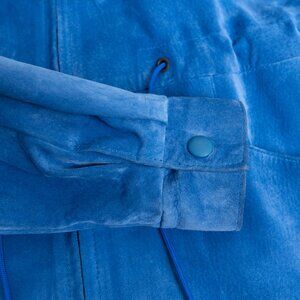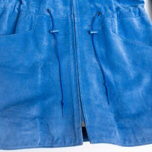 Beautiful vintage Danier suede hooded jacket in a vibrant cobalt / cornflower blue. Classic late-80s/1990s anorak style with a relaxed, longline fit and drawstring waist