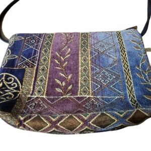 This is a sweet embroidered Tapestry bag. A nice smaller size, but still fits all your essentials. Offers a mix of rich colors that are perfect for fall.