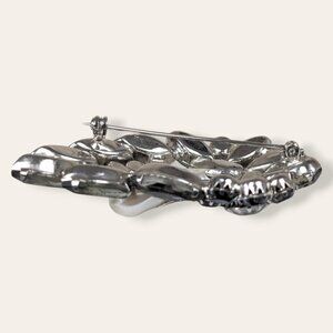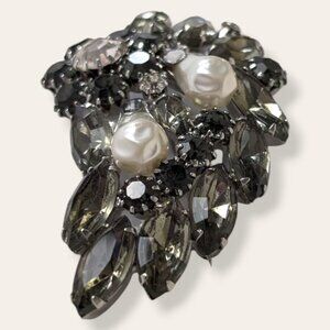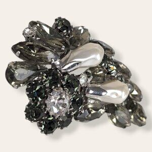 This vintage brooch is made of a silver tone metal and has a modern locking c pin closure. The brooch is a Juliana-style piece with dark glass stones in a number of different cuts. Nestled in the dark stone, there are also 2 funny shaped white faux pearls. The brooch has normal wear, but no issues affecting wearability. As far as I can tell, there are no missing stones.