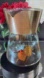 Clear glass with gold and aqua design; black handle and lid; gold-tone metal collar